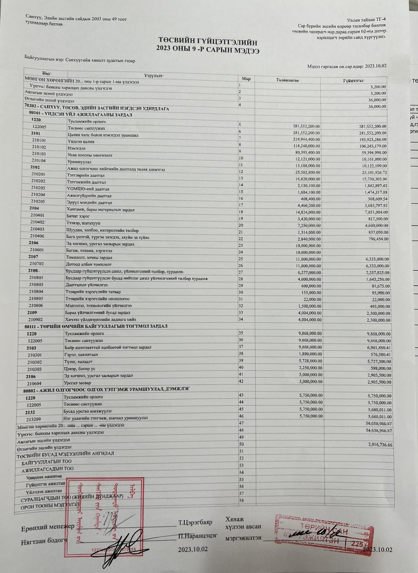 2023 оны төсвийн гүйцэтгэлийн 9 сарын мэдээ