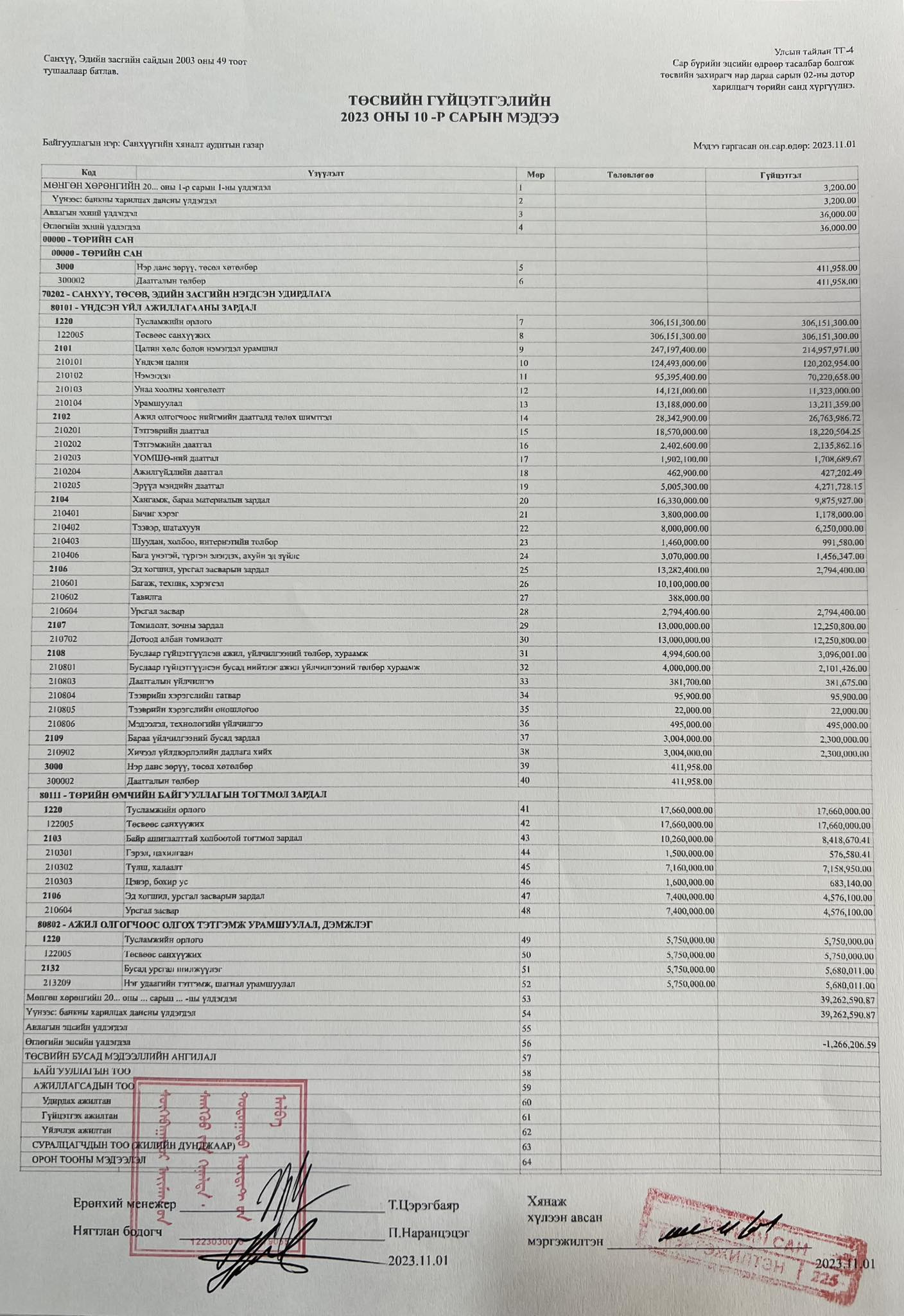 2023 оны төсвийн гүйцэтгэлийн 10 сарын мэдээ