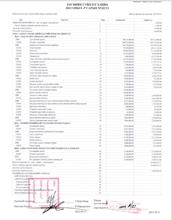 2023 оны төсвийн гүйцэтгэлийн 8 сарын мэдээ