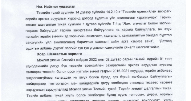 Сангийн сайдын баталсан 2022 оны 02 дугаар сарын 14-ны өдрийн СХШХ/01 дугаар бүхий “ХУУЛЬ БУС ШИЙДВЭРИЙН УЛМААС ТӨРИЙН АЛБАНААС ХАЛАГДСАН АЖИЛТНУУДАД ТӨСВӨӨС ОЛГОСОН НӨХӨН ОЛГОВОР, ТҮҮНИЙГ ХОЛБОГДОХ ХУУЛИЙН ДАГУУ БУРУУТАЙ ЭТГЭЭДЭЭР НӨХӨН ТӨЛҮҮЛСЭН ЭСЭХ АСУУДЛААР ХЯНАЛТ ШАЛГАЛТ ХИЙХ НЭГДСЭН УДИРДАМЖ”-ийн дагуу системийн нэгдсэн шалгалт өнөөдрөөс буюу 2022 оны 02 дугаар сарын 16-наас эхэлж байна.