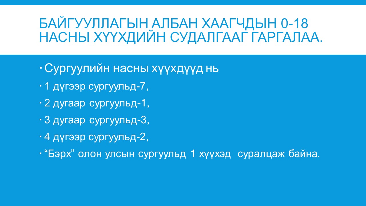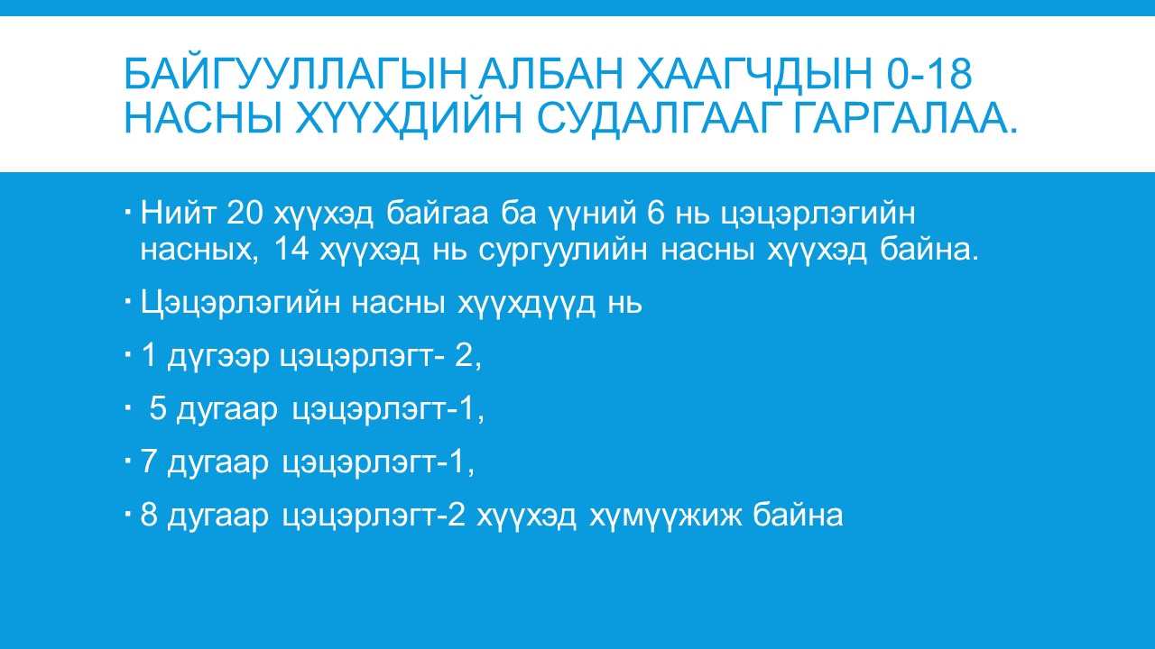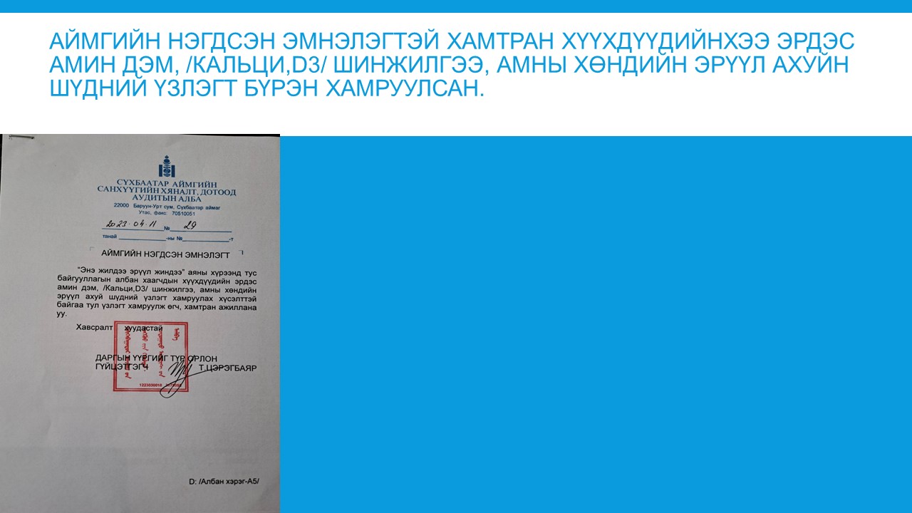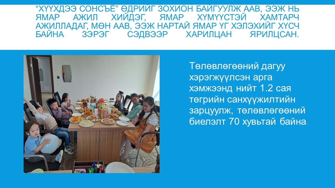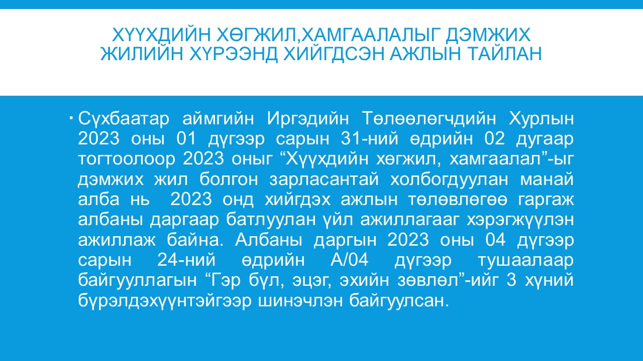 Сүхбаатар аймгийн Иргэдийн Төлөөлөгчдийн Хурлын 2023 оны 01 дүгээр сарын 31-ний өдрийн 02 дугаар тогтоолоор 2023 оныг “Хүүхдийн хөгжил, хамгаалал”-ыг дэмжих жил болгон зарласантай холбоотойгоор албан байгууллагуудын дунд дэвтэр, туг манай байгууллагаар аяллаа. “Хүүхдийн хөгжил_ хамгаалал”-ын жилийн хүрээнд тус алба нь дараах ажлуудыг хийлээ.